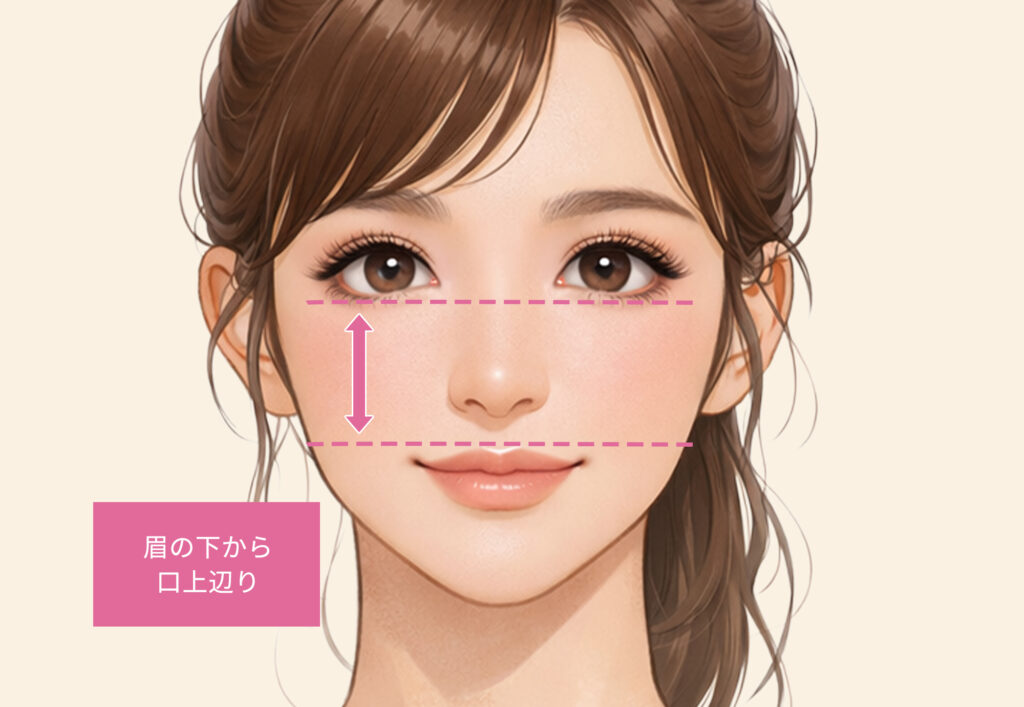 各パーツの位置関係の特徴を知っておくと、どこを調整するとバランスが取りやすいのかがイメージしやすくなり、中顔面短縮メイクのポイントもつかみやすくなります。