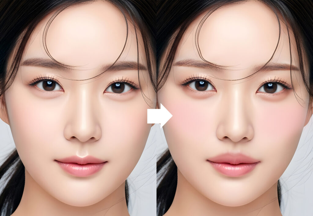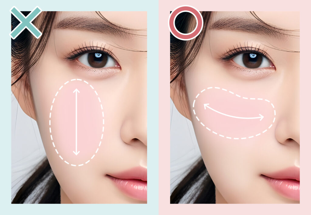 中顔面短縮メイクでは、チークの入れ方も顔の縦横バランスに影響します。頬骨に沿って斜めに入れると縦ラインが強調されやすいため、横幅を意識しながらやや低めの位置に入れるのがポイントです。