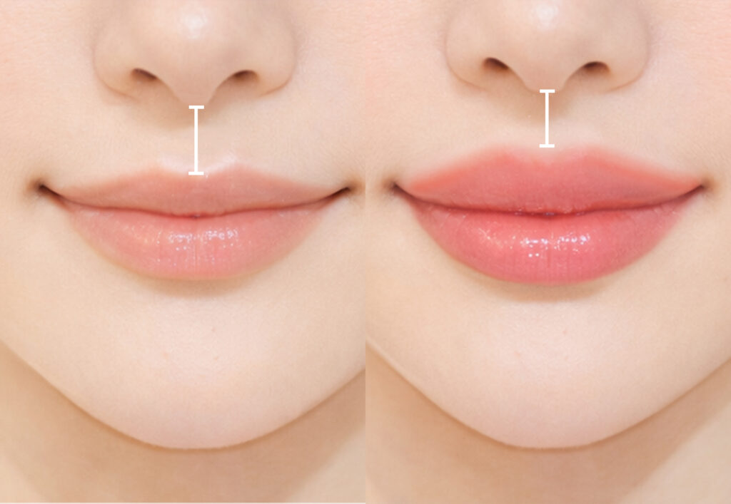 上唇の中央に自然な立体感を持たせて輪郭を安定させることで、顔の縦比率が強調されにくくなり、中顔面を短く見せることにつながります。