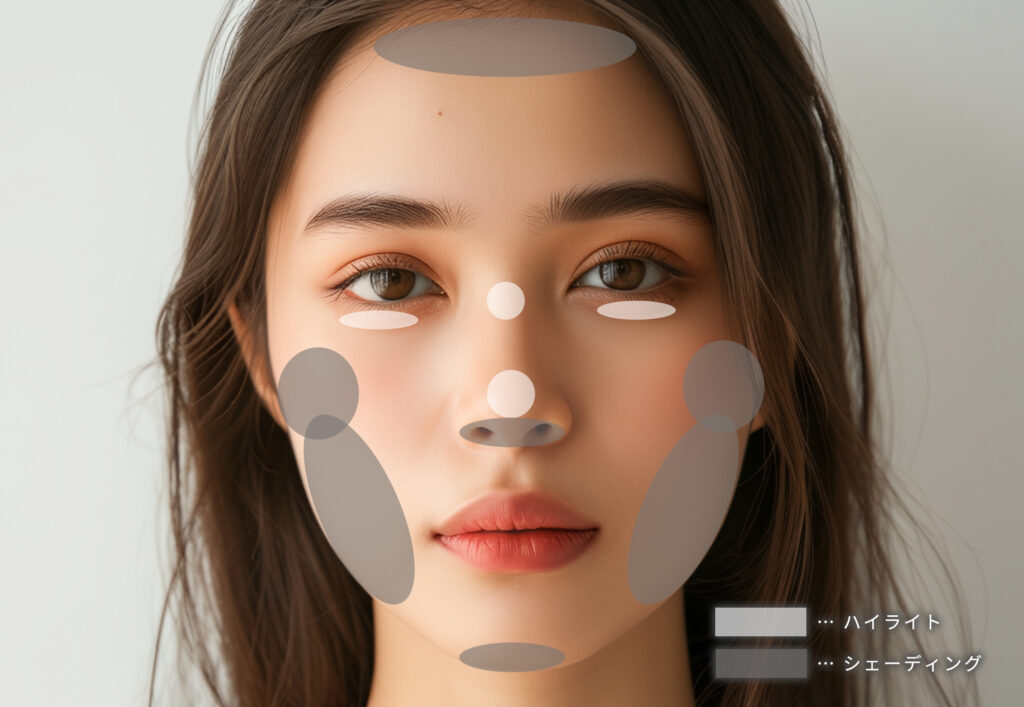 中顔面短縮メイクでは、シェーディングとハイライトの入れ方によって、顔の縦の余白を目立たせにくくすることができます。縦ラインを強調しない配置を意識することで、顔全体のバランスが整いやすくなります。