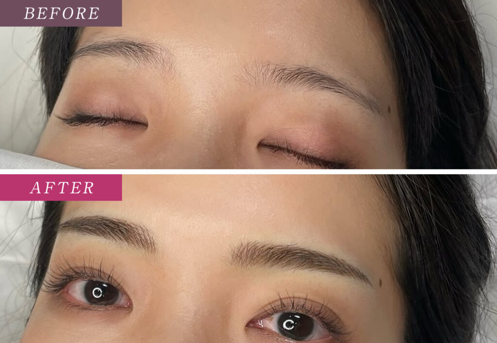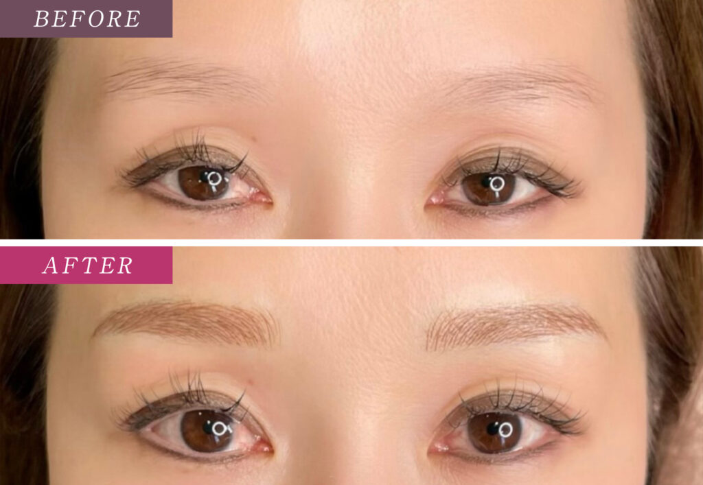アートメイクで毛流れを1本1本補うことで自然な立体感を加え、眉頭から眉尻までバランスの取れた印象に整えました。